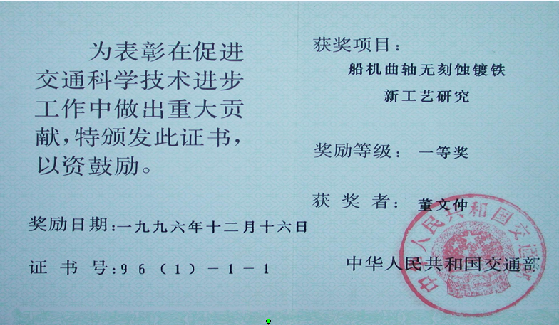◆ 1996年 “船機曲軸無刻蝕鍍鐵新工藝研究”獲交通部科技進步一等獎;