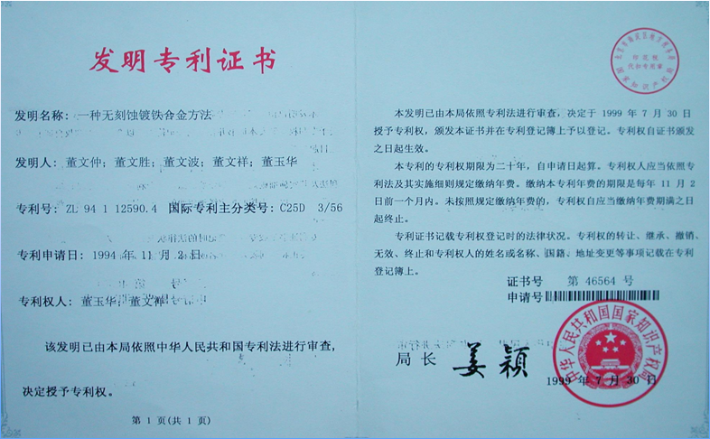 ◆ 1999年 “一種無刻蝕鍍鐵合金方法”獲中國發明專利;
