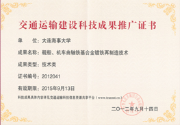 ◆ 2012年 “鐵基合金鍍鐵再制造技術”獲得交通部交通運輸建設科技成果推廣證書。